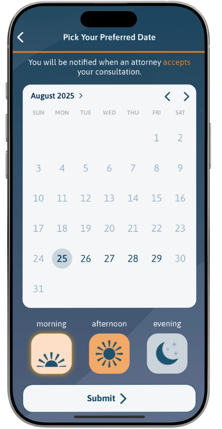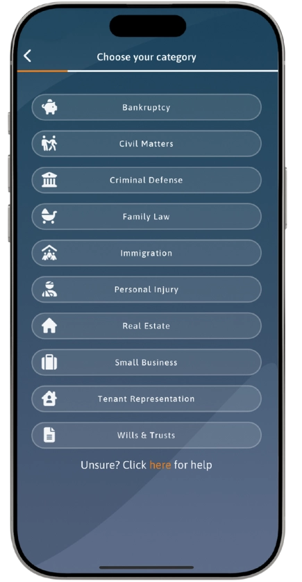 When Scheduling a Consultation, the app will guide them through a series of questions to help identify their legal needs and gather information for their assigned attorney, making it easy to connect via phone call or video chat to discuss their matter.